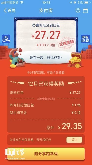 目前,活动已经开奖,用户通过支付宝首页的轮播图或者搜索“15亿”,即可查看自己的红包瓜分情况。瓜分的红包将在8小时内到账,可通过支付宝首页->卡包->券进行查看。