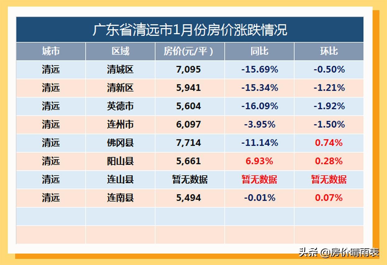 三线城市广东省清远市1月份各区县房价涨跌情况