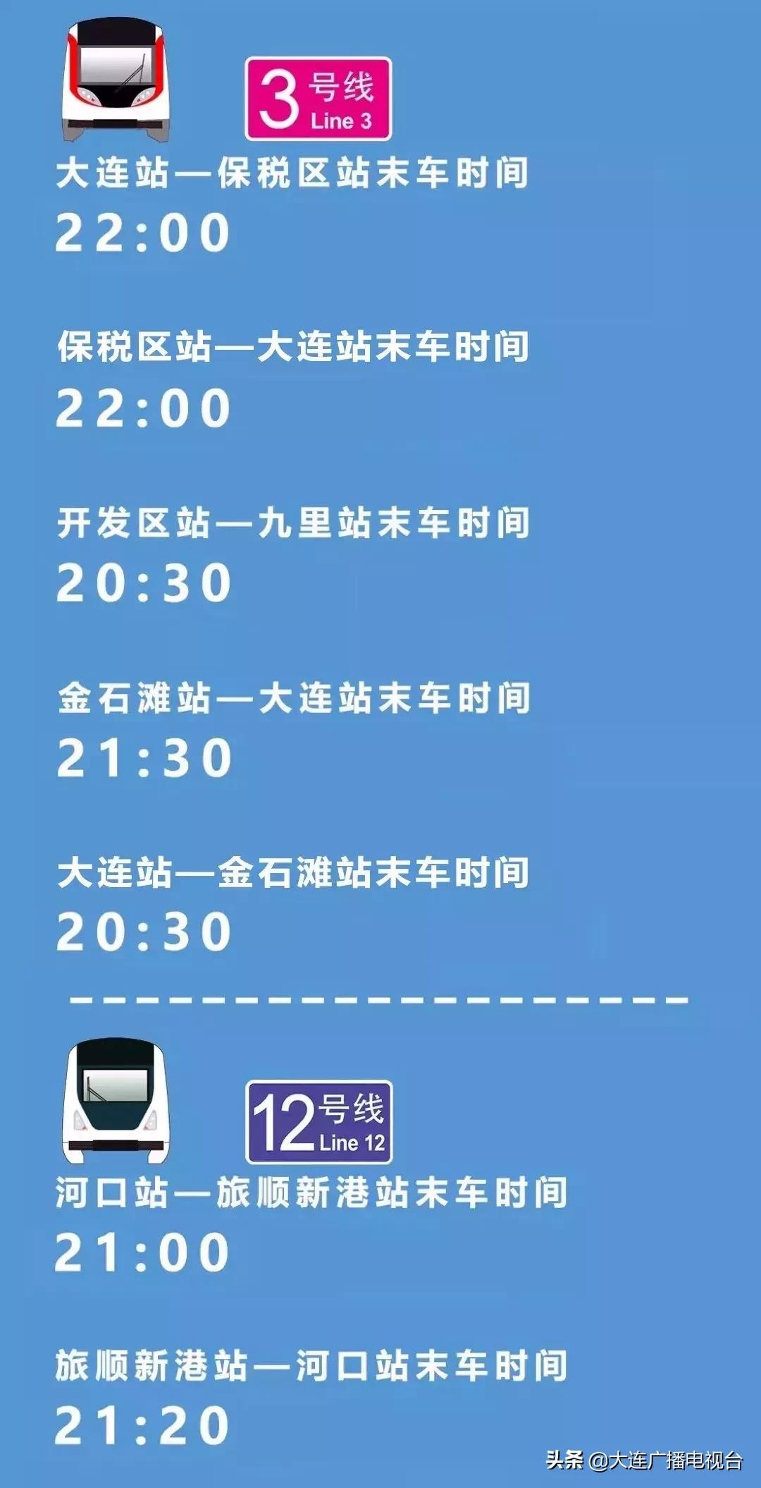 地铁3号线大连站—保税区站双向末车至22:00,开发区站—九里站双向末车至20:30,金石滩站—大连站末车至21:30,大连站—金石滩站末车至20:30;