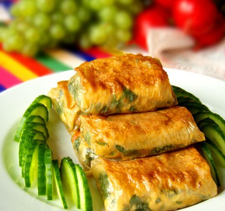 注 :也可以用紫菜做皮,就成为褐红色相间的卷状,也可用鸡,鱼,虾等为肉馅。
