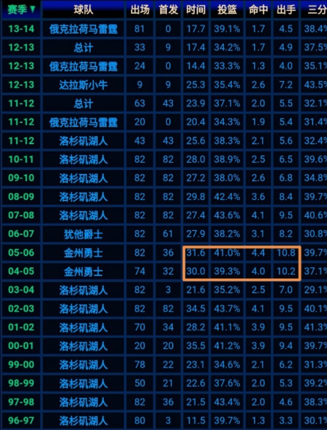 2004年,湖人土崩瓦解,老鱼被送去勇士呆了两年,这两年是他个人数据最好看的两年,也是他生涯18年仅有的两次缺席季后赛。