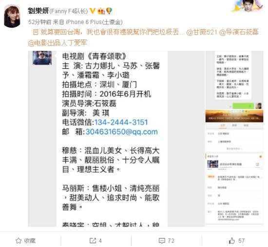台湾艺人刘乐妍从性感女团“女F4”退出后,进军大陆市场却屡遭挫折,此前曾有报道称她被当地导演、制片前后共8人要求陪睡,而她因出演映射王宝强离婚案的电影《宝宝别哭》也遭到抵制,不得不痛哭开直播请求原谅。但25日,她又在微博发表长文,否认自己曾经被多人强暴,但直指内地导演石筱磊曾试图潜规则自己,并在自己反抗的过程中多次被其殴打。