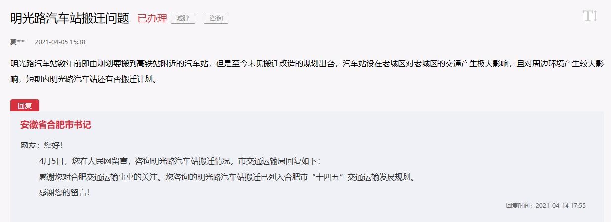 回复:网友:您好!4月5日,您在人民网留言,咨询明光路汽车站搬迁情况。市交通运输局回复如下:感谢您对合肥交通运输事业的关注。您咨询的明光路汽车站搬迁已列入合肥市“十四五”交通运输发展规划。