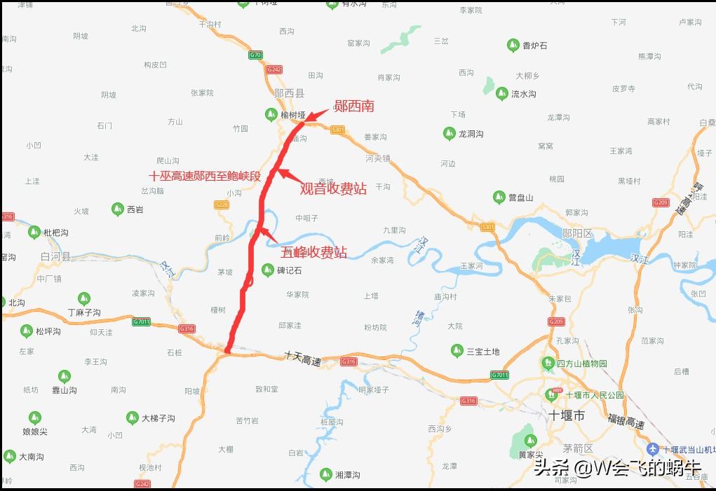 十巫高速郧西至鲍峡段起于郧西县城南天河坪,设郧西南枢纽互通与福银高速公路相接,经郧阳区五峰乡,止于郧阳区鲍峡镇以东的雷家院,设鲍峡枢纽互通与十天高速公路、十巫高速公路鲍峽至溢水段相接,全长34.8公里,建设工期48个月。将设置郧西南、观音、五峰三个匝道收费站。