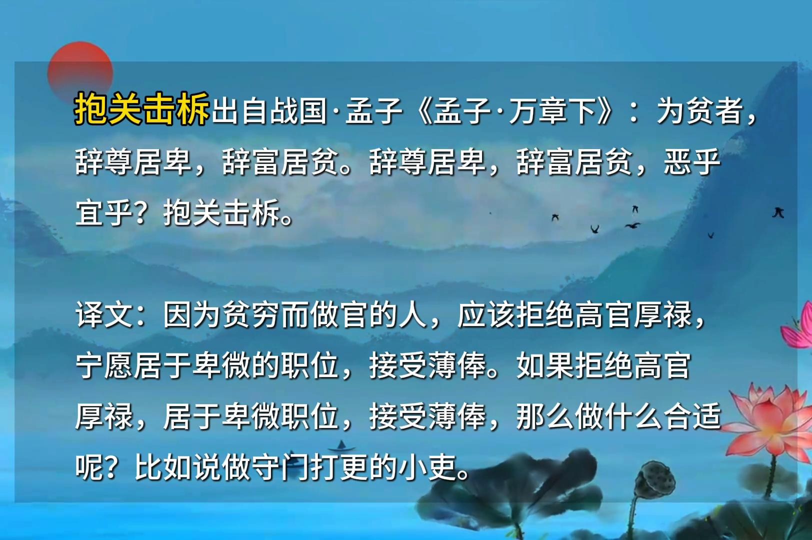 译文:因为贫穷而做官的人,应该拒绝高官厚禄,宁愿居于卑微的职位,接受薄俸。如果拒绝高官厚禄,居于卑微职位,接受薄俸,那么做什么合适?比如说做守门打更的小吏。寓意:守关巡夜的人。比喻职位卑下。