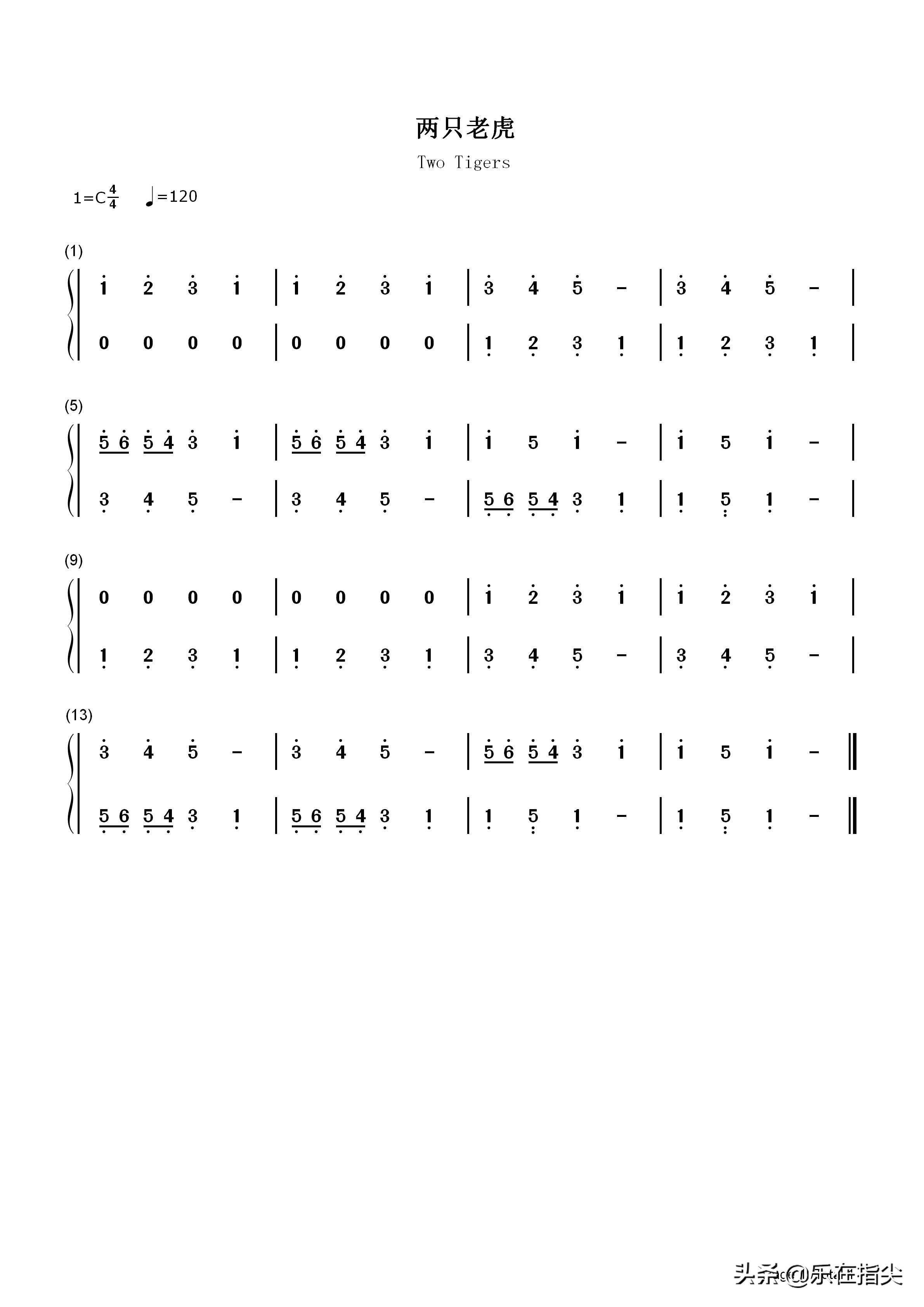 两只老虎-简谱五线谱钢琴谱电子琴谱