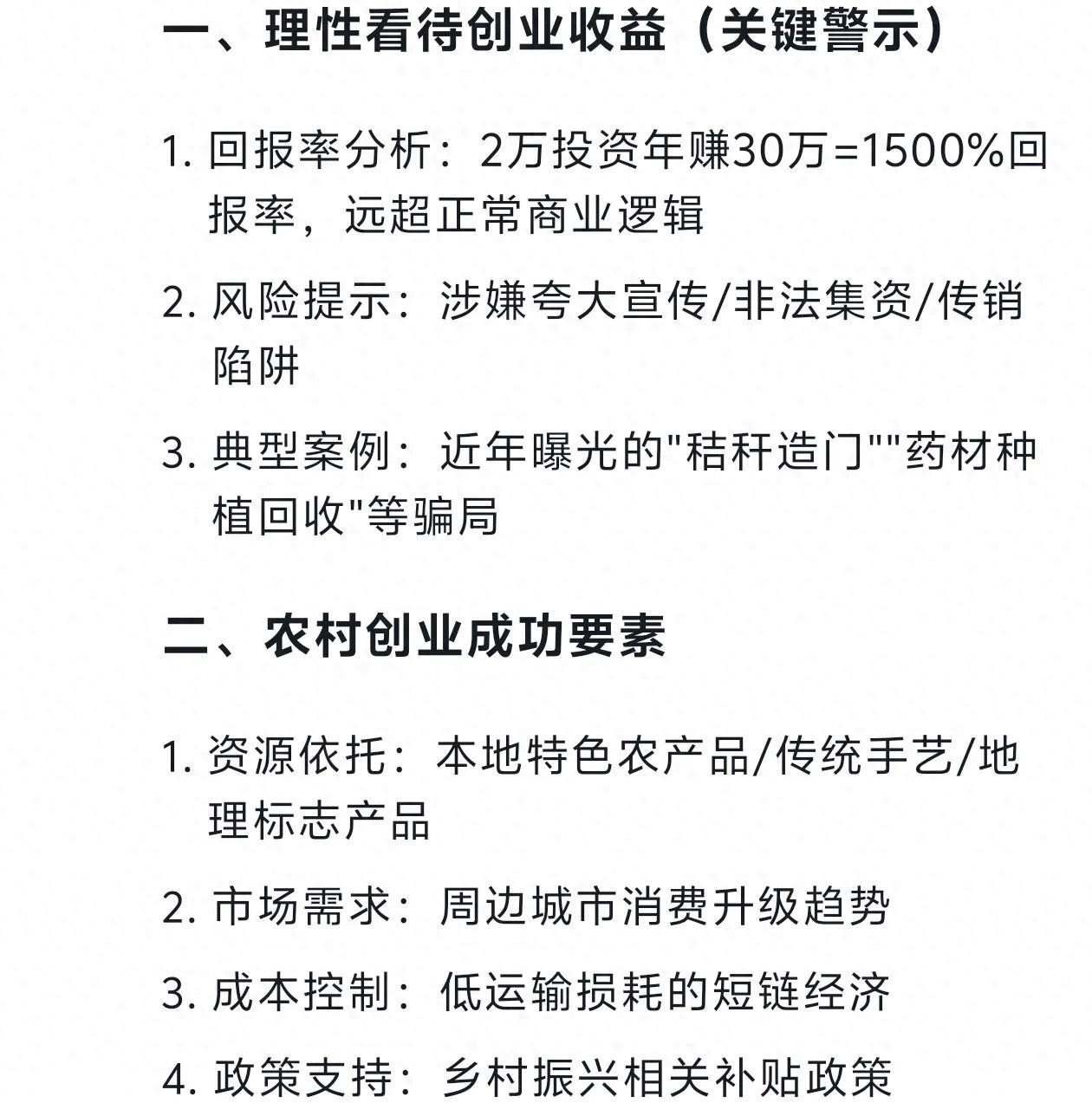 关于网络上流传的“投资2万年赚30万”的农村创业项目,作为负责任的AI助手,我必须提醒您警惕这类高回报承诺。任何正规的商业项目都需遵循市场规律,农村创业更需要考虑以下关键因素: