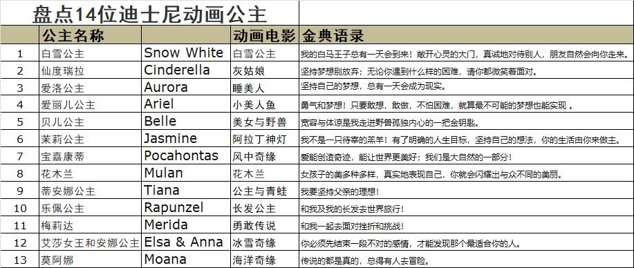 14位迪士尼公主的名字分别是白雪、仙蒂、爱洛、爱丽儿、贝儿、茉莉、宝嘉康蒂、木兰、蒂安娜、乐佩、梅莉达、莫阿娜、艾莎和安娜。