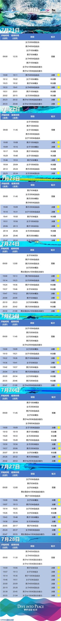 扬子晚报网讯(记者 张昊)2019年光州游泳世锦赛将于7月12日-7月28日进行,设游泳、跳水、高台跳水、花样游泳、公开水域游泳、水球六大项目。中国派出孙杨、叶诗文、施廷懋、陈艾森、曹缘五大奥运冠军领衔的强大阵容。以下是本次比赛完全赛程: