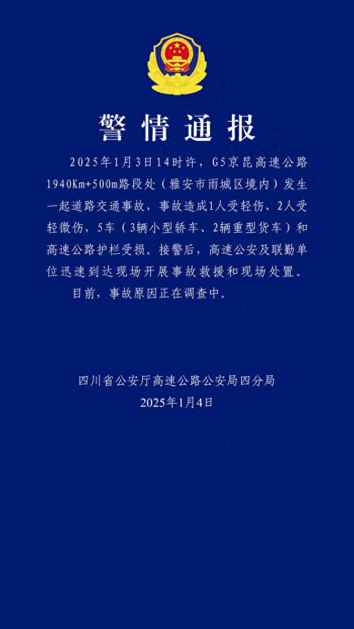 四川省公安厅交通警察总队高速公路四支队1月4日通报,1月3日14时许,G5京昆高速公路1940Km+500m路段处(雅安市雨城区境内)发生一起道路交通事故,事故造成1人受轻伤、2人受轻微伤,5车(3辆小型轿车、2辆重型货车)和高速公路护栏受损。接警后,高速公安及联勤单位迅速到达现场开展事故救援和现场处置。目前,事故原因正在调查中。
