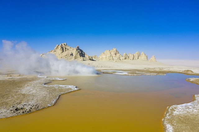 来到茫崖,不能不打卡的还有艾肯泉。艾肯泉又被形象地称为“恶魔之眼”。这是茫崖市莫合尔布鲁克草原深处的一处地质奇观。由于这里有喷涌了近千年的地热喷泉,又因为地下矿物质极其丰富,喷泉所喷出的物质呈现出各种颜色,其中最为奇特的瞳孔造型喷泉打造物,便是这只镶嵌于地表的“眼睛”——艾肯泉。