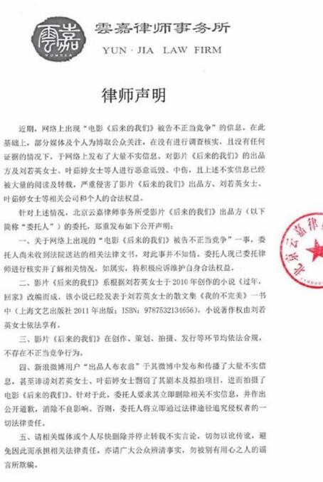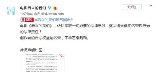 1月8日,电影《后来的我们》官微发声明辟谣因不正当竞争被告传闻,称:“电影《后来的我们》,依法采取一切必要的法律手段,坚决追究侵犯名誉权行为的法律责任!创作者的合法权益与名誉,不容恶意践踏。”
