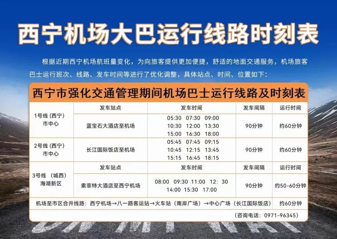 根据近期西宁机场航班量变化,为向旅客提供更加便捷、舒适的地面交通服务,青海机场公司对旅客巴士运行班次、线路、发车时间等有所优化调整,具体站点、时间、位置如下。