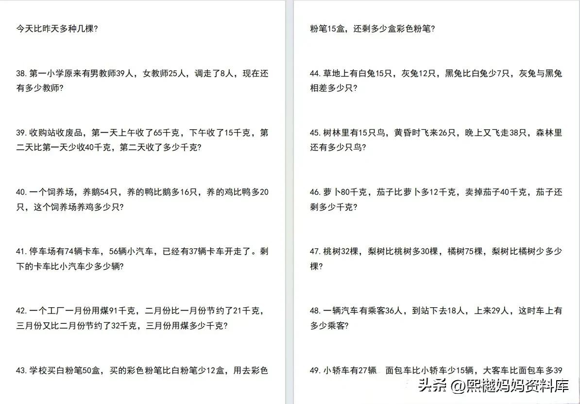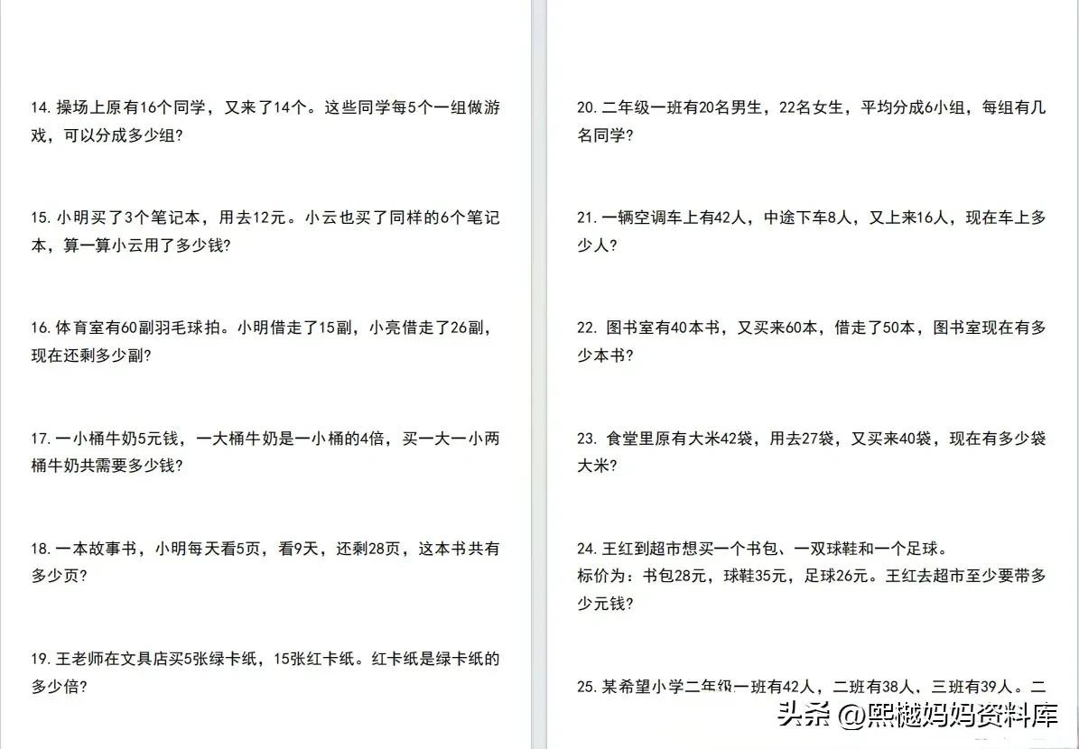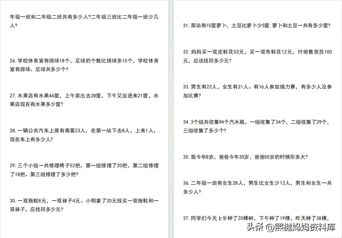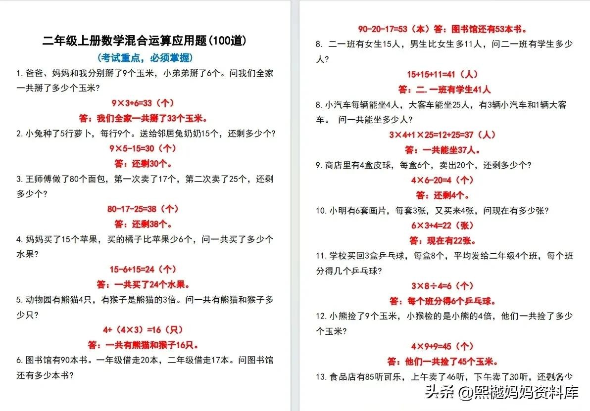 二年级数学混合运算应用题100道附答案