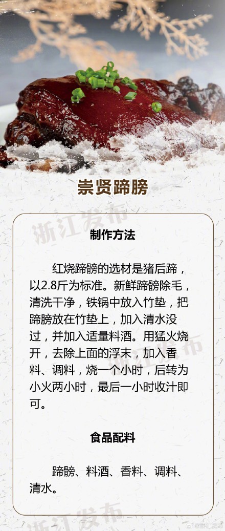 崇贤蹄膀,是杭州临平人办酒请宴聚会必不可少的一道“硬菜”,它选用两斤半左右的猪后腿肉,加入老抽、老姜、葱,烧上三个小时。要做得好吃需掌握“三步火候”:先用旺火把咸味逼进肉中,再用文火焖酥烂,最后用旺火把汤熬浓。这样做出来的蹄膀喷香扑鼻、油而不腻、酥而不烂。(浙江文旅)