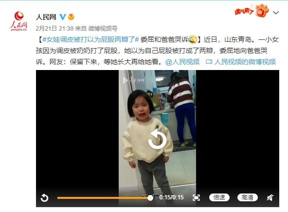 近日,山东青岛。一小女孩因为调皮被奶奶打了屁股,她以为自己屁股被打成了两瓣,委屈地向爸爸哭诉。网友:保留下来,等她长大再给她看。