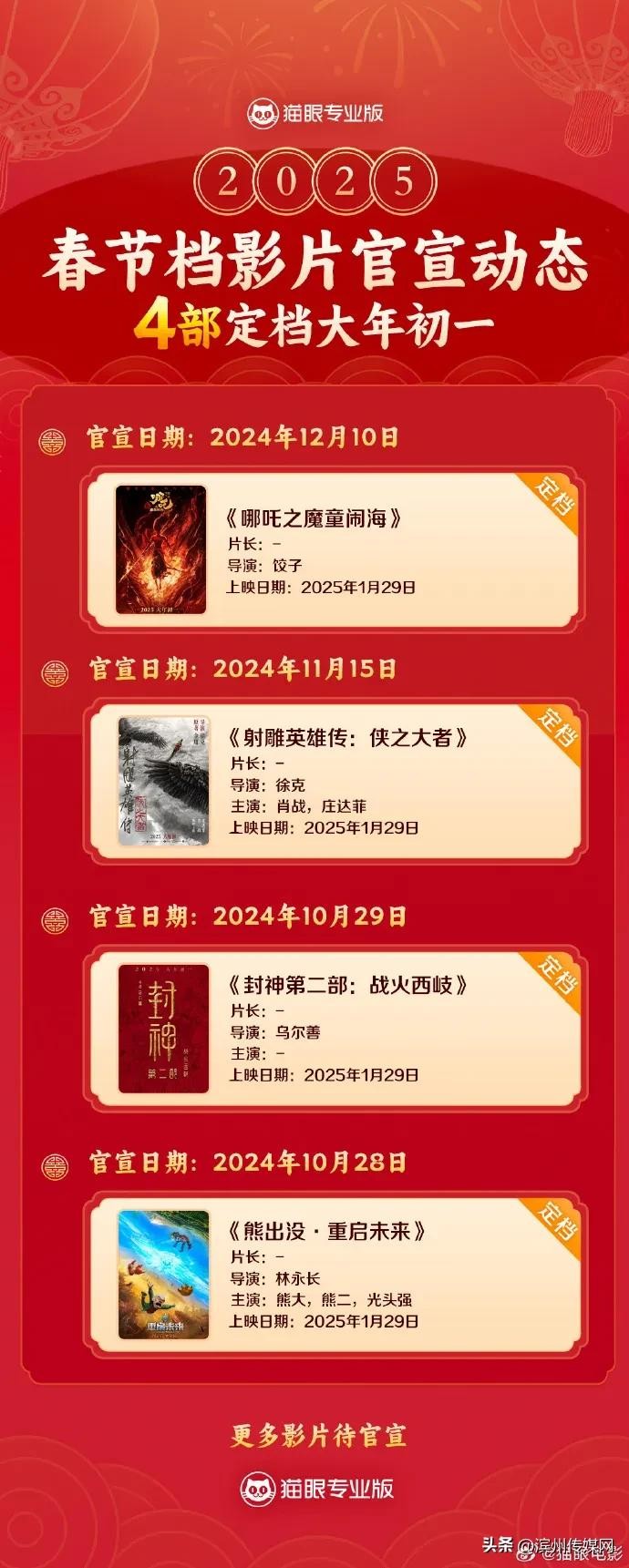 截至目前,共有4部影片定档2025年春节档上映,分别为《哪吒之魔童闹海》《射雕英雄传:侠之大者》《封神第二部:战火西岐》《熊出没·重启未来》,你想看哪一部呢?