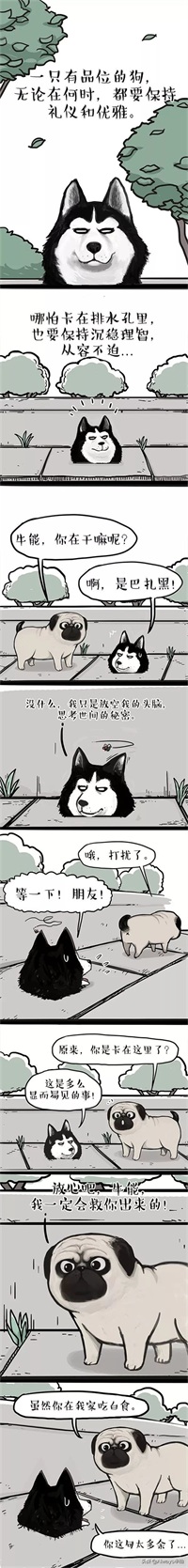一直有品位的狗,无论在何时,都要保持礼仪和优雅。哪怕卡在排水孔里,也要保持沉稳理智,从容不迫...牛能,你在干嘛呢?啊,是巴扎黑!没什么,我只是放空我的头脑,思考世间的秘密。