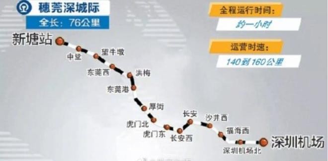 穗莞深城际原定于9月30日开通运营,但受工程进展影响,开通时间将推迟,具体开通时间未定。穗莞深城际铁路主线北起新塘站、南至深圳机场站,全长76千米,共有15座客运站;设计速度140千米/小时。