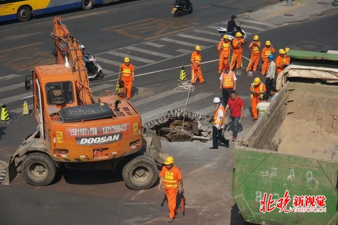 京广桥路面坍塌现大坑 塌陷原因尚未确定(组图)
