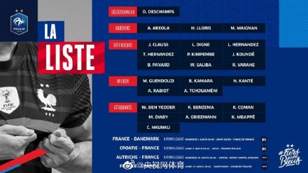 法国公布最新一期国家队大名单:本泽马、姆巴佩领衔,恩昆库入选,博格巴、吉鲁缺席,具体名单如下: