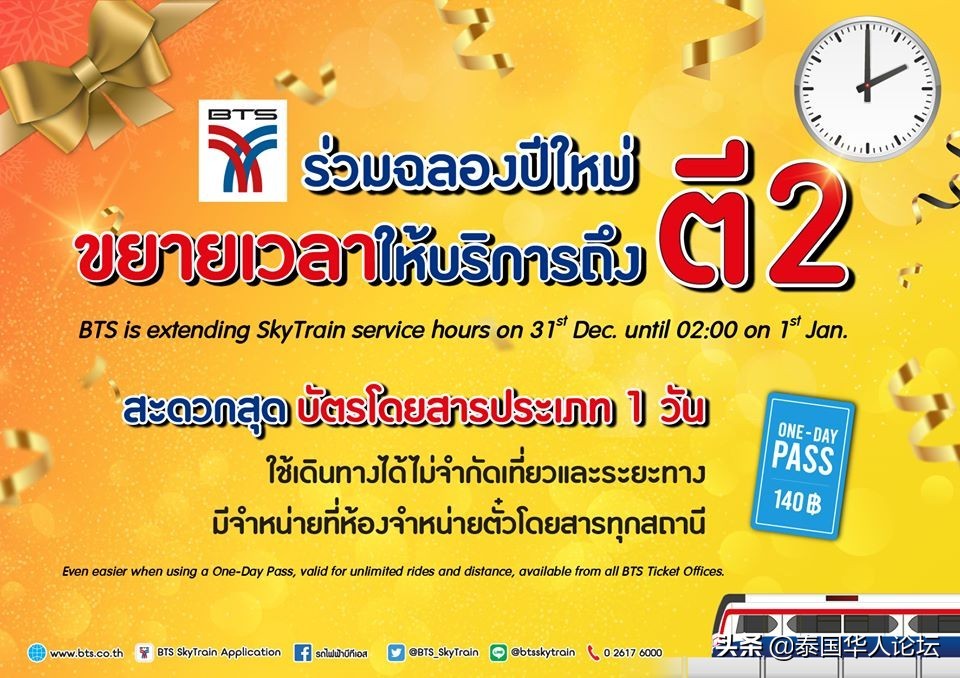 泰国新泰日报社讯 12月24日泰媒报道,泰国曼谷大众运输系统公共有限公司负责人素拉鹏表示,在2020年辞旧迎新之际,公司将携手The Krungthep Thanakom公司延长2019年12月31日的BTS服务时间,即从原来的24:00延长至2020年1月1日02:00,以为去参加辞旧迎新活动的乘客提供便利。此外,公司还将增加BTS班次,以便足以承接乘客。此外,素拉鹏预计在上述时间内乘客数量将会增加,公司将增加工作人员为乘客提供服务,且还将增设售票桌。