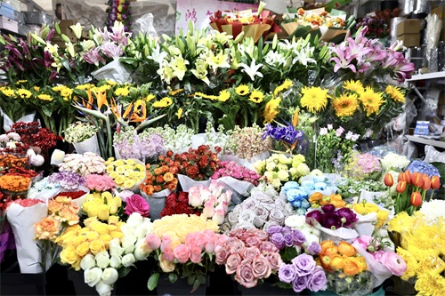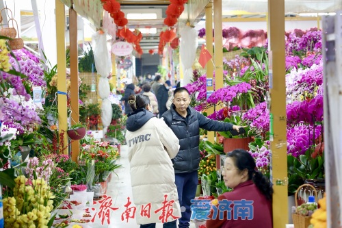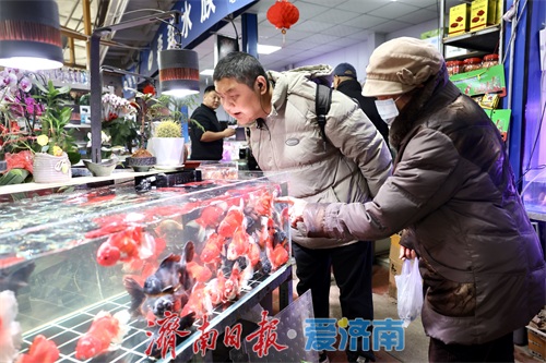 春节将至,济南老东门花卉水族市场热闹非凡。市场内挂着红灯笼,洋溢着喜庆氛围。