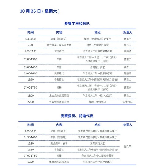 根据日程安排,今日13:00-22:00为报到时间;10月26日为考试日,早上9:00-12:00进行理论考试,下午15:00-16:00进行实验考试;10月27日晚上21:00-23:00可进行查分申请;10月29日晚上19:00-21:00进行闭幕式。