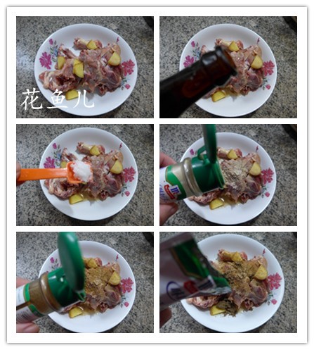 (3)接着,加适量的料酒、加适量的盐、加适量的胡椒粉、加适量的孜然粉、加适量的椒盐粉调味拌匀腌制1小时。
