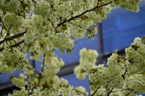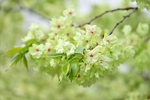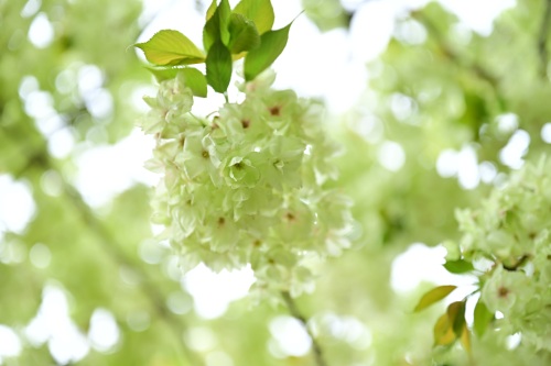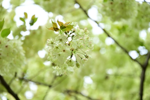与常见的樱花不同,郁金樱是花叶同放