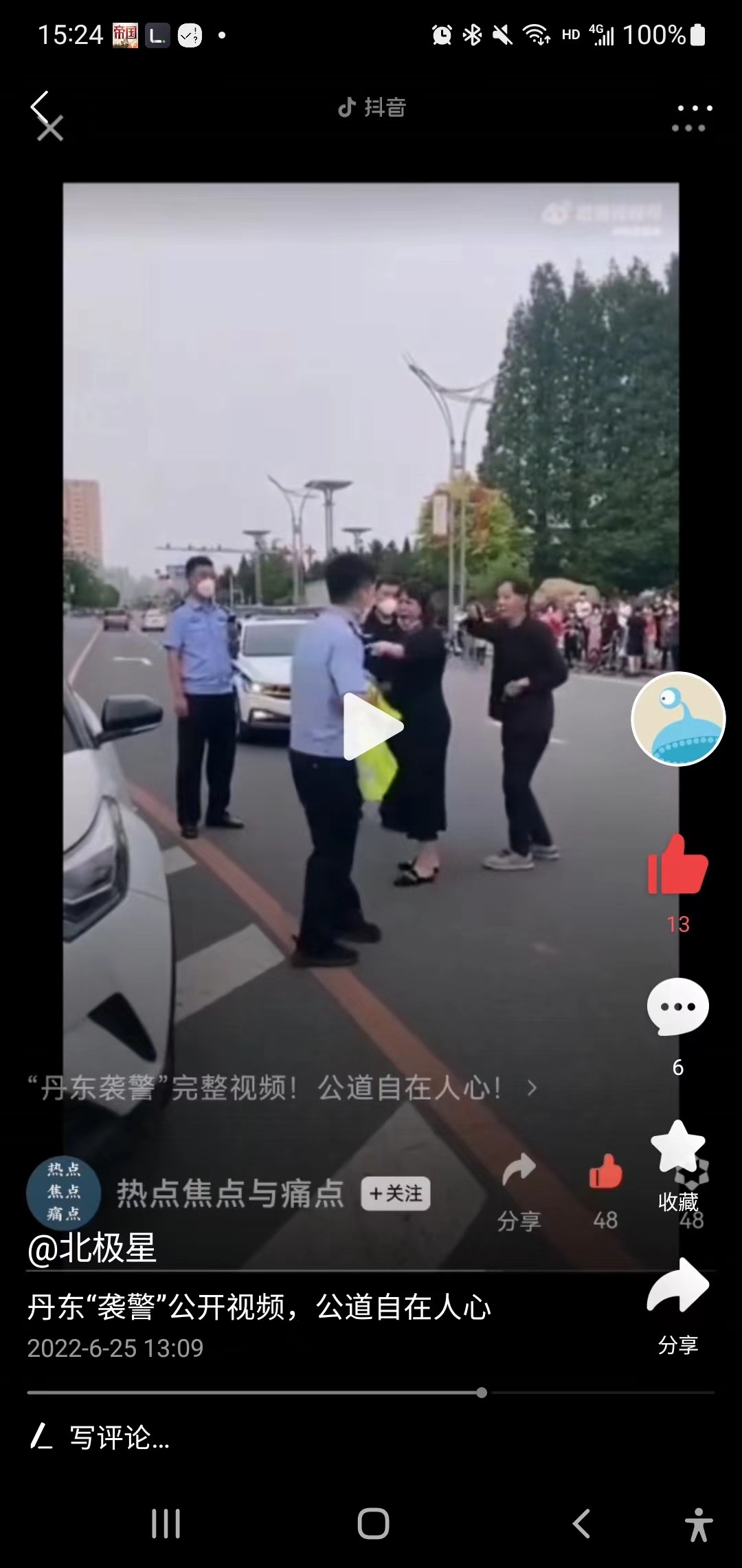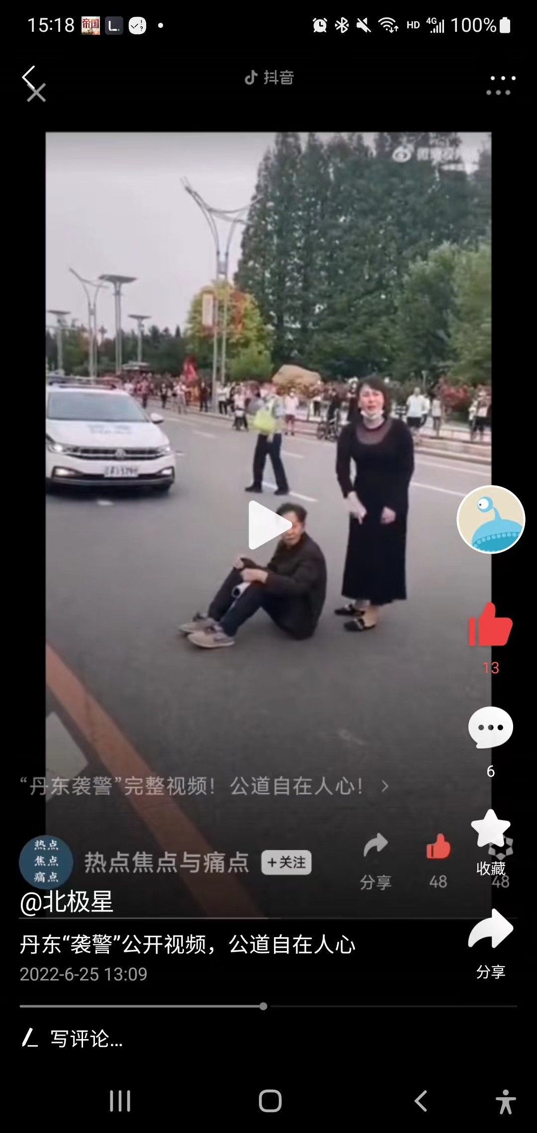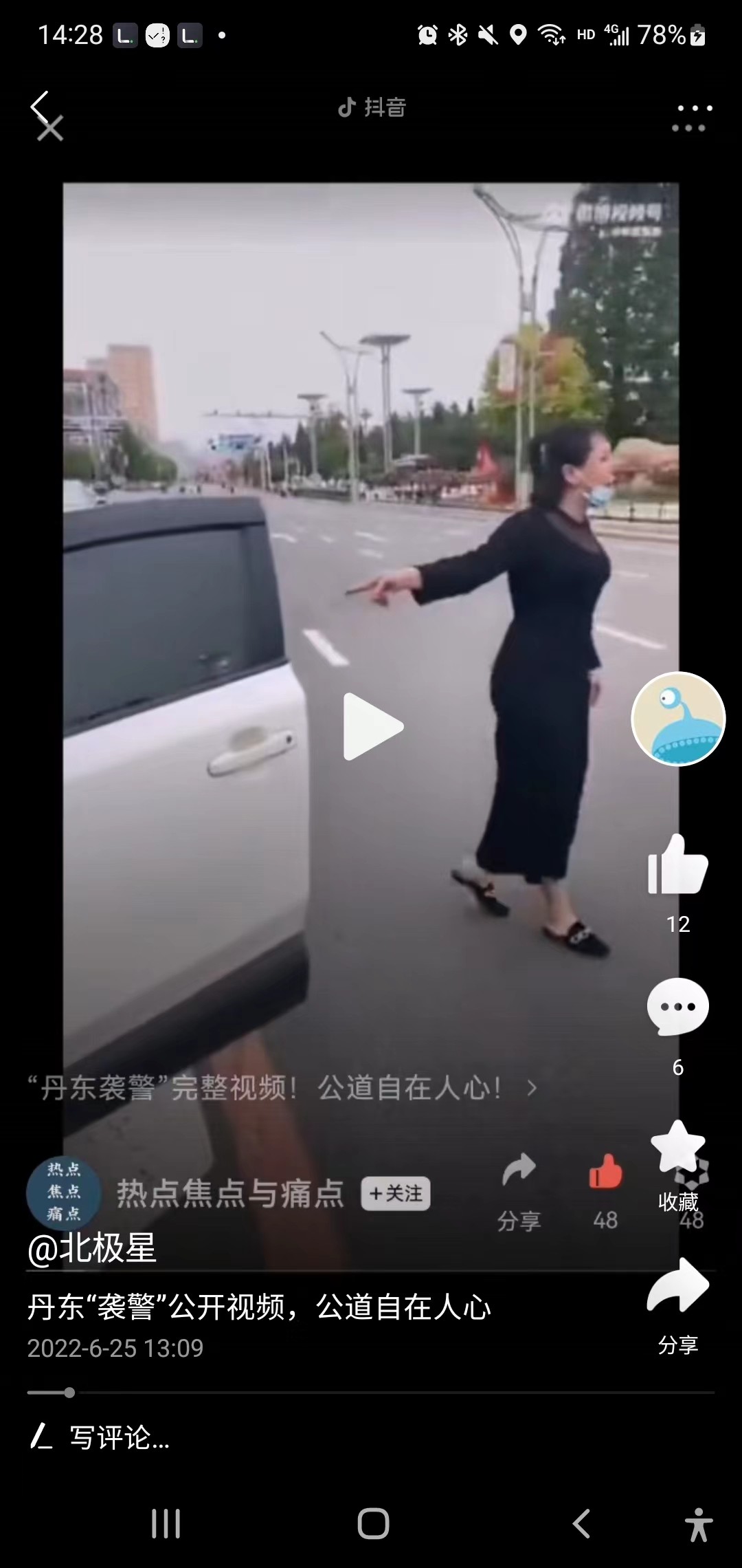 这个时候女子往前的时候,说我要上我的车,并说我要上我的车,警察说我不能让你上车,然后女子倒地,警察这里用胳膊挡了一下也可以认定为推,我认为这里这个推的动作并不违规,女子已经持续要强行上车,警察可以采取一定的手段,女子倒地之后立马来了几句警察打人了。这个时候估计想用舆论压力来逼迫警察,说警察打人,