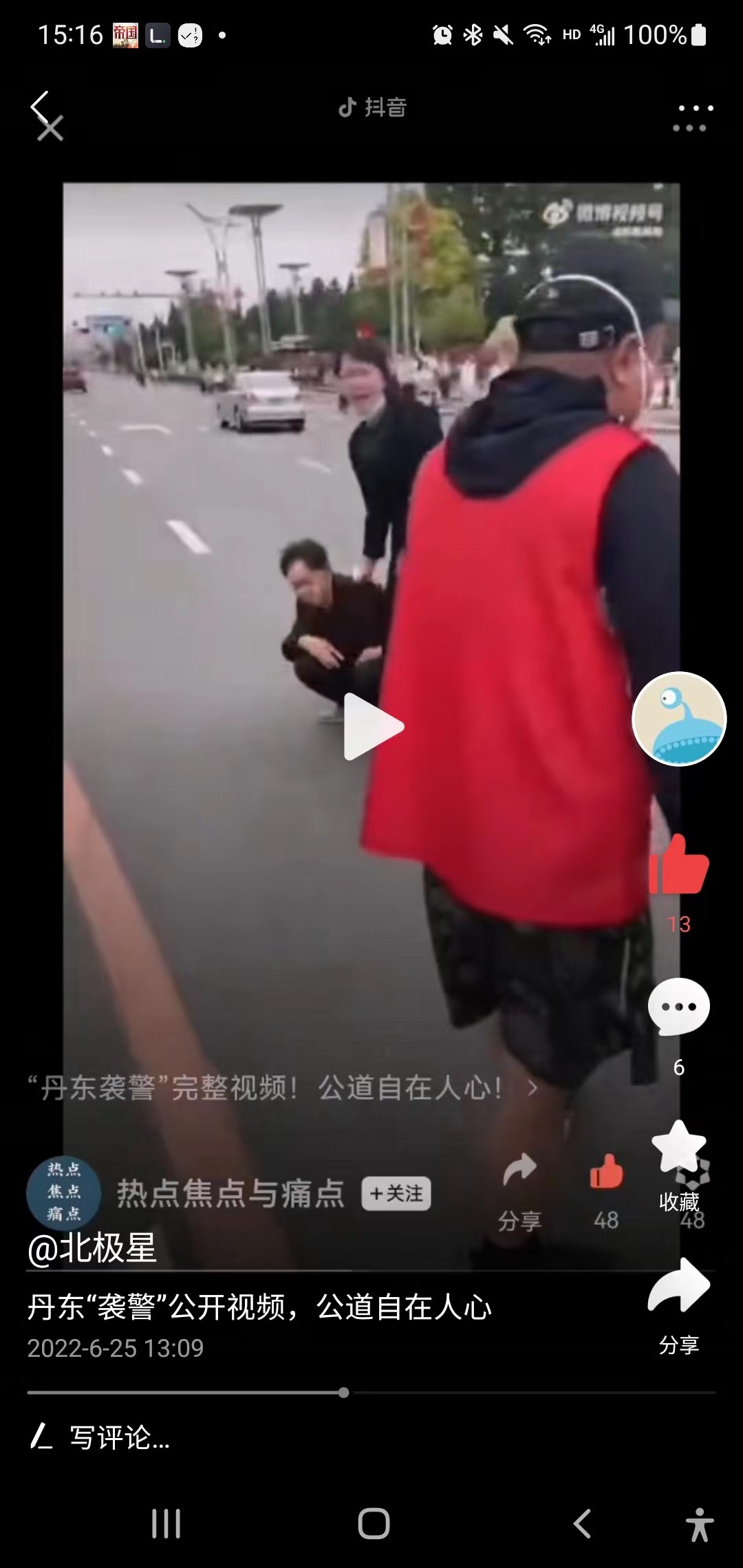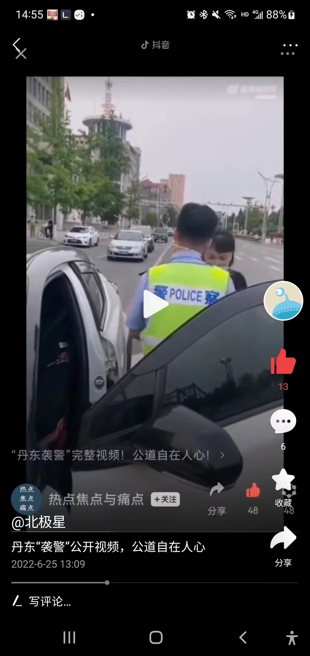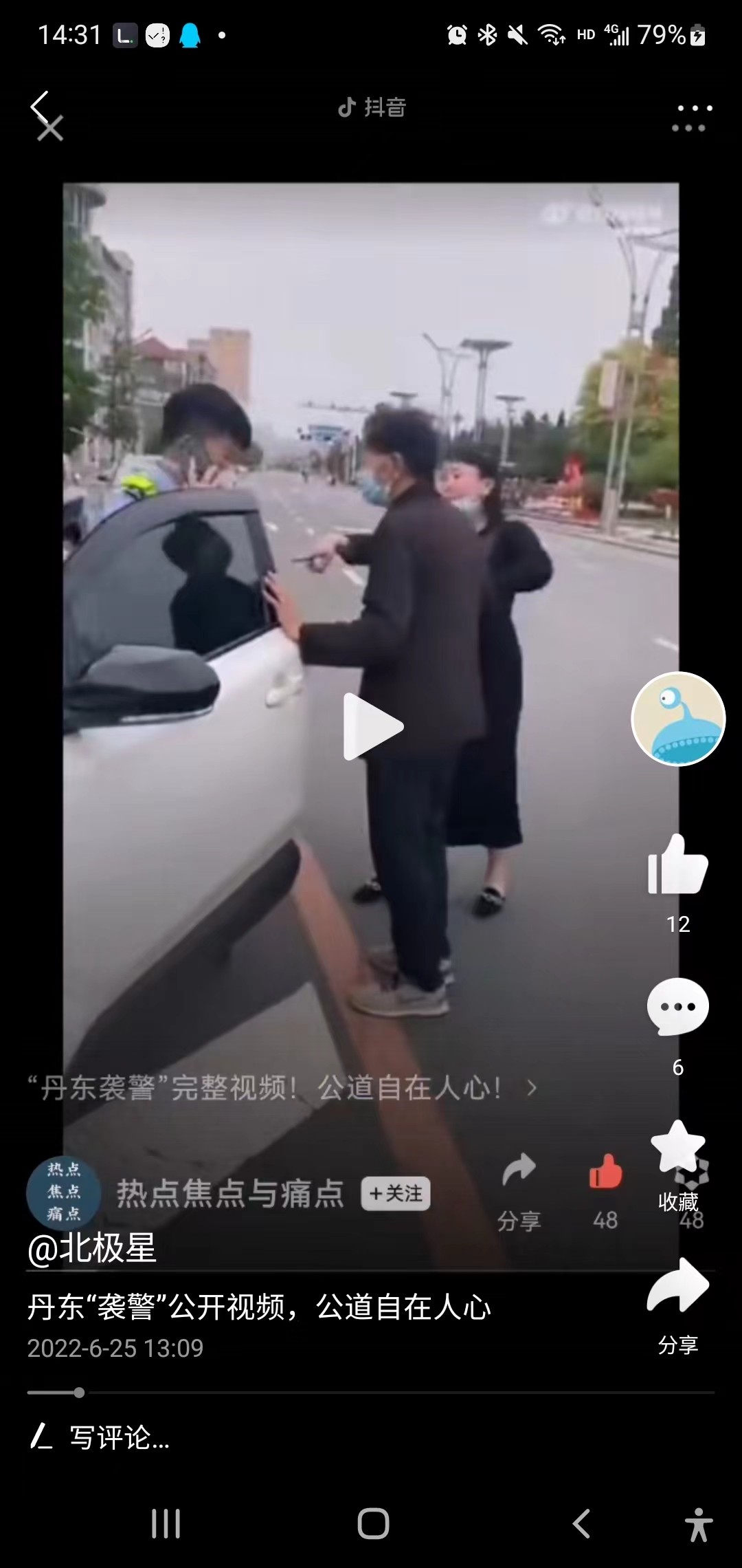 这个时候女子往前的时候,说我要上我的车,并说我要上我的车,警察说我不能让你上车,然后女子倒地,警察这里用胳膊挡了一下也可以认定为推,我认为这里这个推的动作并不违规,女子已经持续要强行上车,警察可以采取一定的手段,女子倒地之后立马来了几句警察打人了。这个时候估计想用舆论压力来逼迫警察,说警察打人,