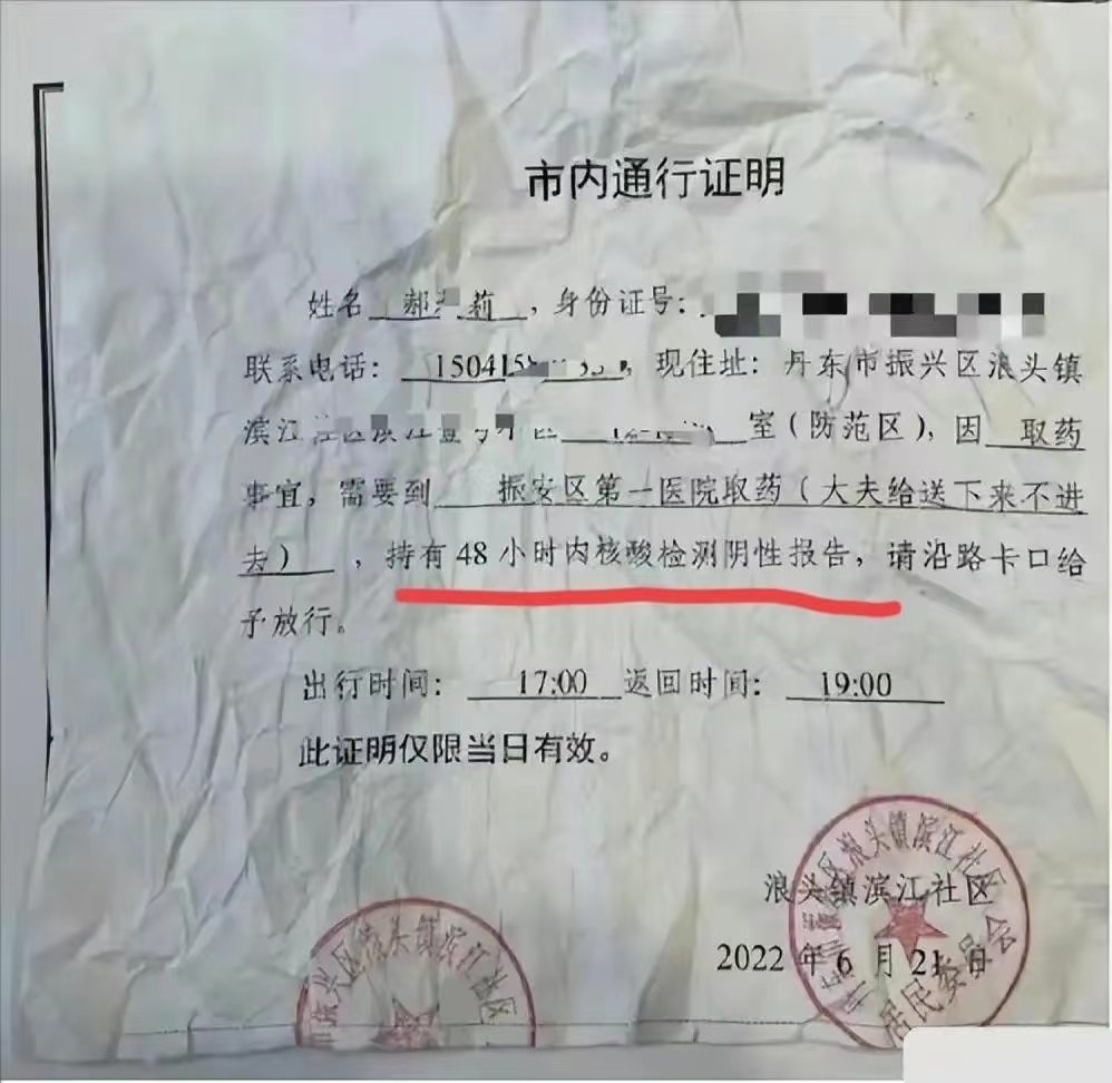 我们可以看到这个社区的证明里面只写了女子一人的名字和身份证号,那就是只能一人通行,第二个就是写了是需要去取药,送下来不进去,所以也不涉及看病的问题,这里标注了医院名字是重点,稍后详讲。第三就是持有48小时的核酸证明。