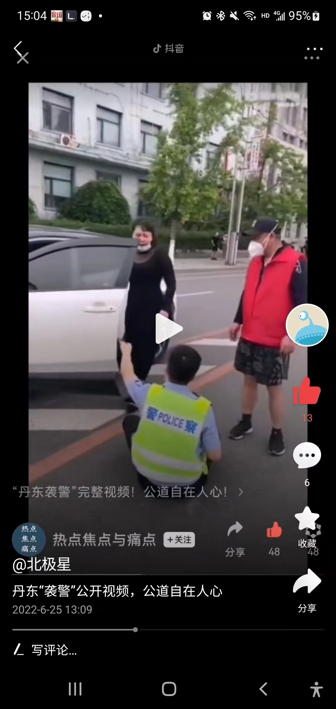 最后说下观点,如果遇到问题,就正常的沟通,把你的诉求说出来,证明不全就等核实,不让去就等着,九分钟的视频,后面能处理的人一半的时间就来了,我不认为这个事情紧急到几分钟等不了,他只是想用这种方式达到自己的目的,警察除了假摔的时候有点不合适之外,其他的处理基本都没有问题,而且全程保持了足够的克制,但凡女子好好说,药都帮你取回来,但是女子证明不全,医院不存在,他的事情经不起查,只能用这种方式试图蒙混过关。