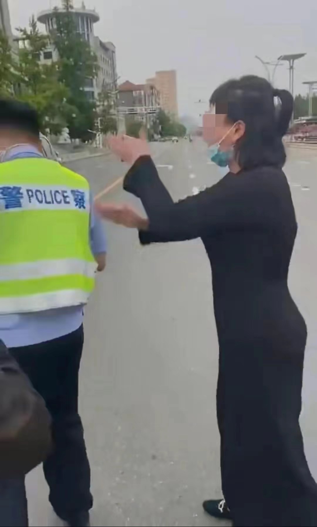 这个时候黑衣警察上前说给你们解决问题,女子说解决什么问题,指着警察说他太年轻了,又说你什么也不是,然后女子就开始大喊,很尖锐的声音。