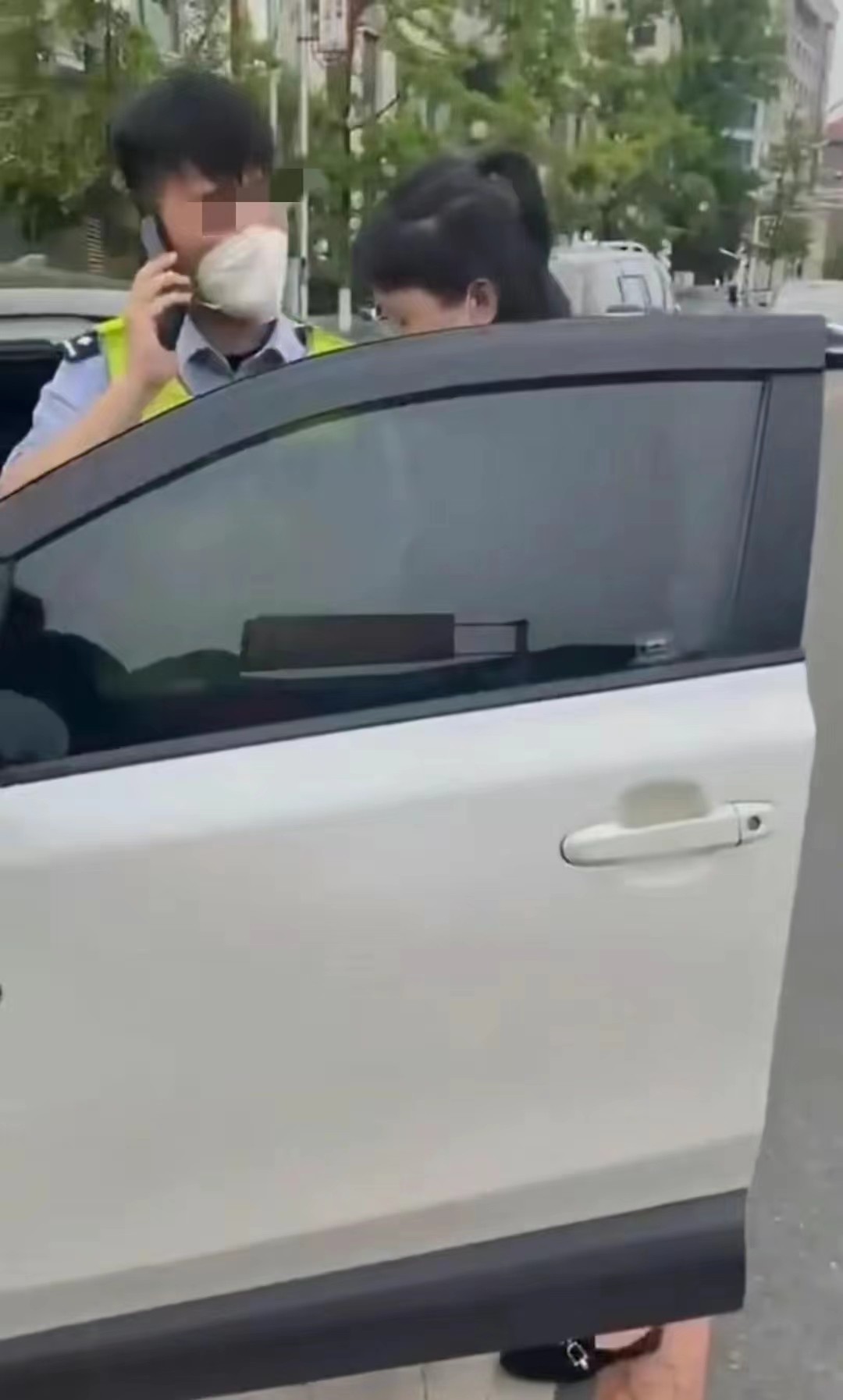 然后就是要上前升车,喊道你给我起来,我要上医院看病,你给我起来,让我上车,警察说了一句不行,然后开始打电话,女子一直要上来,说这是我的车为啥不让我上,我要上车你给我让开,我要关门,但是警察态度坚决,