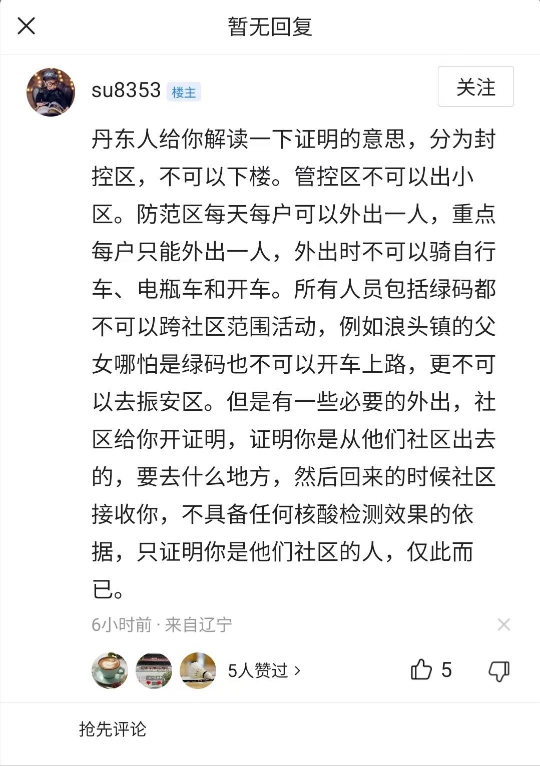外出只能出一人,所以开证明也只开了一个人的,没有理由不能跨区,所以就需要以取药去医院这个名义出去,但是要去的地方是振安区,所以就写了振安区第一医院,也解释了为什么社区的工作人员会开这个错误的地址。