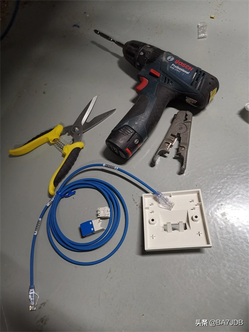 首先,我们安装网络面板与网络模块前所准备的设备,如图所示,手电钻(上螺丝快些),剪刀,剥线刀(此刀十分方便不伤线芯),网络面板,网络模块,网络跳线;还有两个面板螺丝。