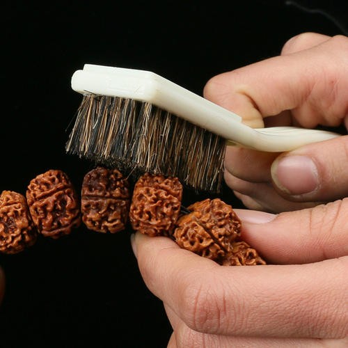 如果入手的金刚菩提很脏的话可以带上手套用钢丝刷刷它直到上面的果肉、果胶清理干净,如果有些细小的缝隙中还是清理不干净可以用钩针抠。可以下水刷也可以干刷,干刷的话反碱会少一点,下水刷的话反碱会多一点。