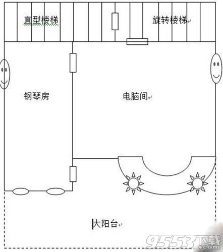 图中,笑脸代表是飘窗,拱形带太阳的是B型弧扇墙,椭圆形是A型窗,而虚线是放栏杆的。