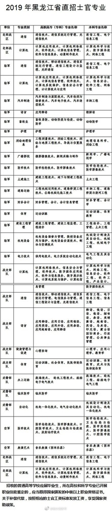 招考信息【我省2019年直招士官专业公布】全国直接招收士官报名起止时间:6月11日至7月5日18时。招收士官对象:男性普通高校应届、往届毕业生,所学专业符合部队需要,未婚,不超过24周岁;政治和体格条件,按照征集义务兵有关规定执行。符合条件的可登录全国征兵网查询详情。