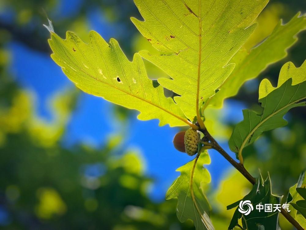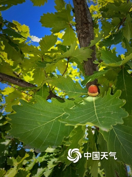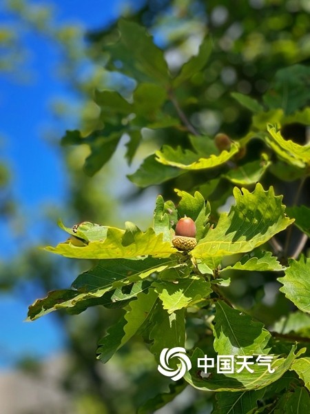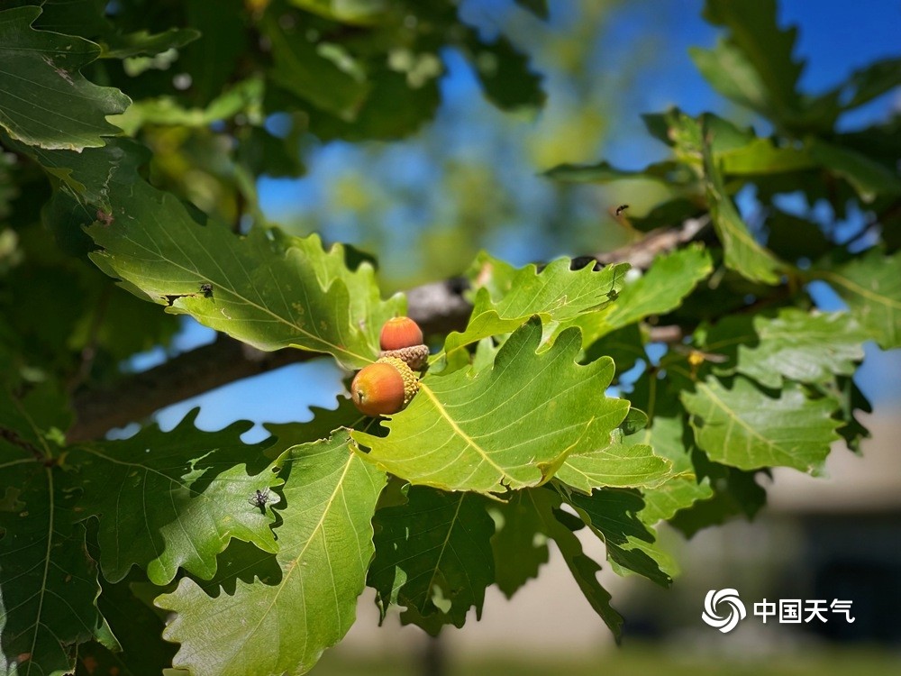中国天气网讯 今天(8月27日),北京天气晴朗,天空湛蓝,体感舒适。橡果又名“爱情坚果”,目前已进入成熟期,一颗颗小巧玲珑的果实挂在枝头,十分可爱。(图/中国天气网王晓)