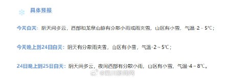 今日11时,成都市平均气温0.8~3.3℃,寒意强烈。重要的是,成都市区还下起了“头皮雪”,引网友热议。 没看到雪的家人们别急,记者从成都市气象台打探到,预计午后到夜间成都市以阴天为主,大部地方有间断小雪,降雪最明显的时段出现在今天晚上,最低气温-2℃。具体预报如下(成都日报锦观新闻 记者 王静宇)