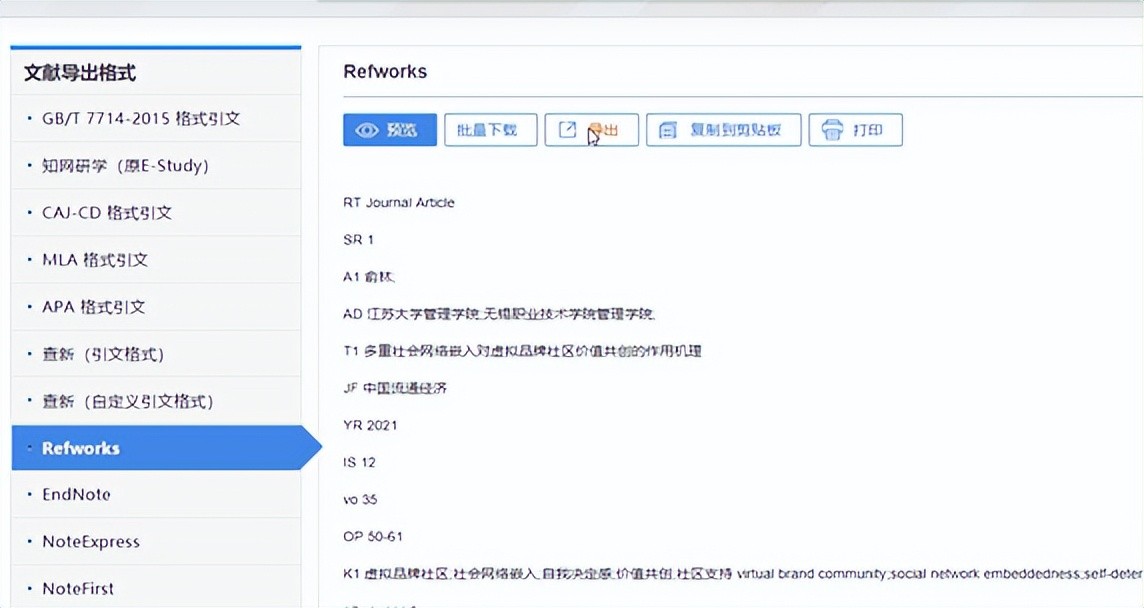 Ⅱ.导出文献。以CNKI中国知网为例,高级检索——手动筛选——导出文献refwork格式(每次最多可以导出500篇,导出的文件要命名为download_XX)——最后将导出的文件拖到input文件夹中。