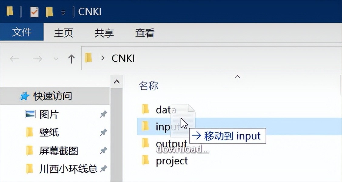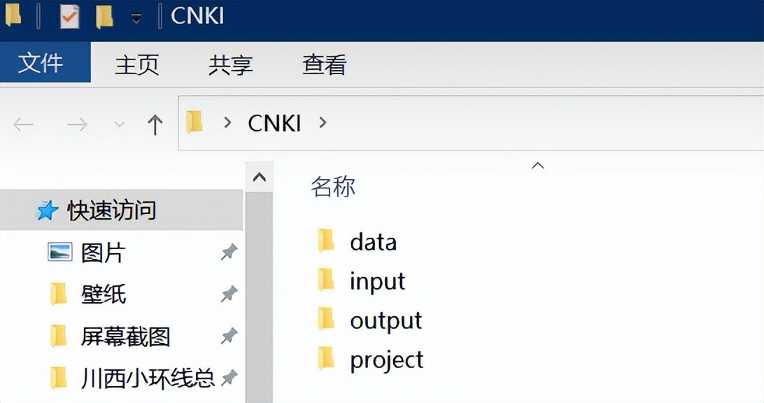 Ⅰ.建立文件夹。首先建立1个英文文件夹CNKI,然后在此文件夹内,建立4个文件夹,分别命名为data、input、output、project,如图所示: