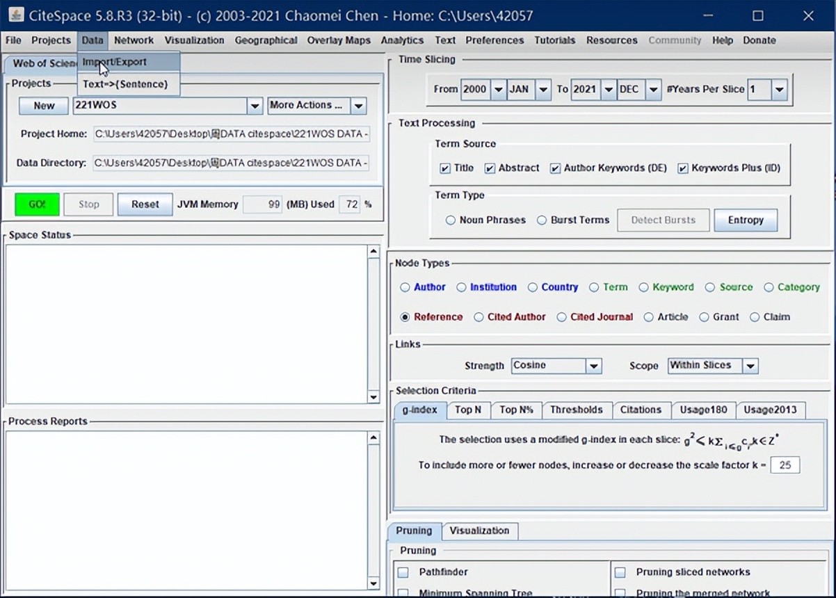 Ⅴ.运行设置。在Time slicing里面选择所选文献的时间范围以及时间切片,接着在Text Processing勾选Term Source,然后在Node Types里面,蓝色和绿色是支持识别的的类别,红色是不支持的,我们勾选蓝绿色的类别即可(文献共被引目前只有英文数据库和CSSCI可以分析,CNKI中国知网和万方尚不能分析)。最后在pruning里面勾选pathfinder使结果的线条更加清晰美观。设置完上述参数,我们就可以点击GO!