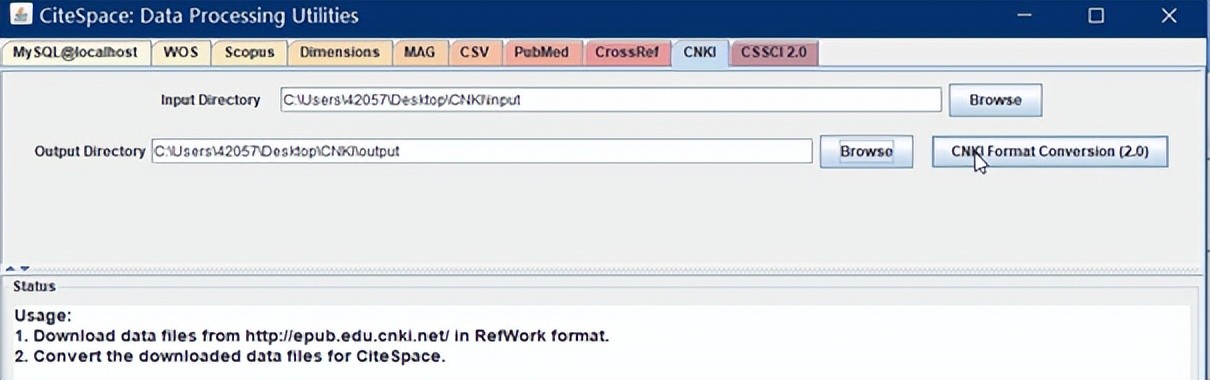 Ⅲ.导入文献。运行CiteSpace后在菜单栏点击Import/Export选项,由于我们是从CNKI导出的文献,所以在弹出对话框后选择CNKI,然后在Input Directory一栏中选择文件夹input,在Output Directory一栏中选择文件夹output。最后点击CNKI Format转化。