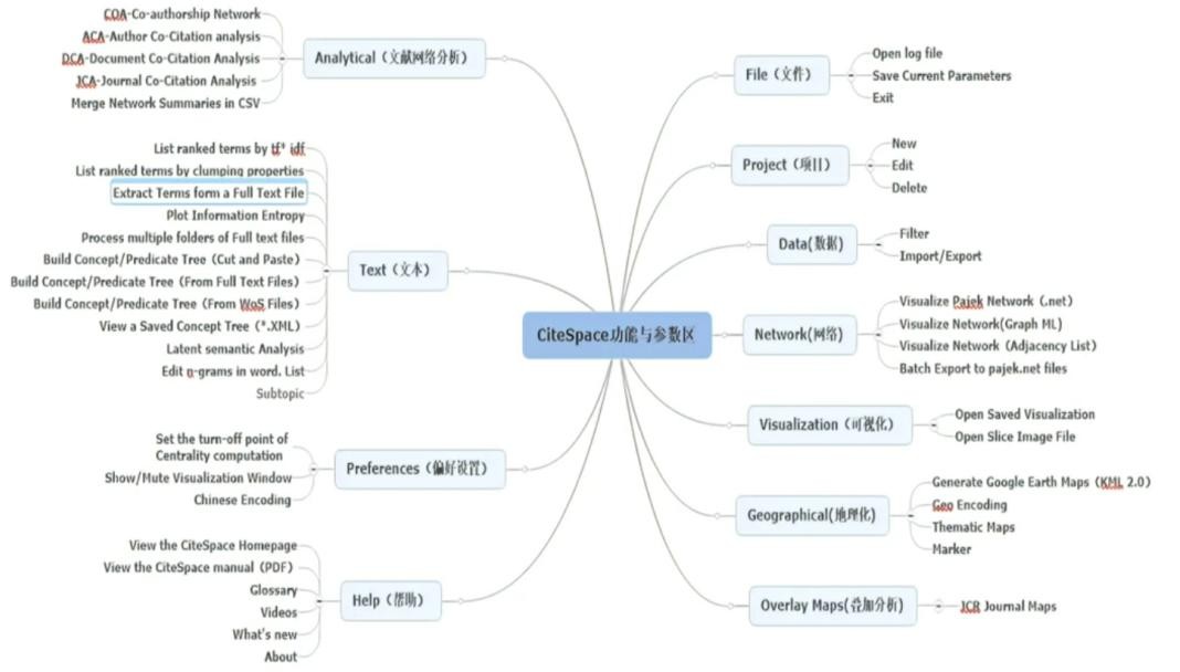 CiteSpace可以用来对文献进行基本分析,如分析引文与文献发表总数、重点学科和期刊、科研机构研究和合作情况、作者分析等;也可以进行聚类和突变分析,如分析关键词频数、关键词聚类以及时区图(突变分析)。以下是CiteSpace的菜单功能概览图: