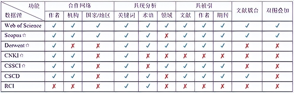 比如对于CNKI中国知网,CiteSpace只能进行关键词分析的操作。具体各个数据库可供分析的功能参考下图,便于大家按图索骥选择合适的数据源和分析功能。
