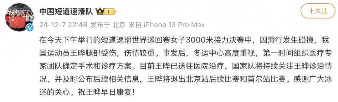 在今天下午举行的短道速滑世界巡回赛女子3000米接力决赛中,因滑行发生碰撞,我国运动员王晔腿部受伤,伤情较重。事发后,冬运中心高度重视,第一时间组织医疗专家团队确定手术和诊疗方案。目前王晔已送往医院治疗。国家队将持续关注王晔诊治情况,并及时公布后续相关信息。王晔将退出北京站后续比赛和首尔站比赛。感谢广大冰迷的关心。祝王晔早日康复!